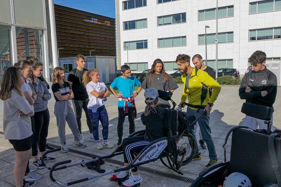 Los alumnos de cuarto curso del Grado en Ciencias de la Actividad Física y del Deporte de UNEATLANTICO, han llevado a cabo una práctica novedosa de senderismo adaptado, con unas sillas jöelette cedidas por la Asociación Arrastrasillas, además de realizar un circuito con infraestructura y técnicas concretas para guiar a personas con diversidad funcional visual a través del medio natural. La práctica se ha realizado en el recinto universitario, desde el pabellón deportivo hasta las diferentes ubicaciones exteriores del campus y ha contado con representantes de la organización para explicarles el trabajo que llevan a cabo y ofrecerles testimonios reales de los beneficios que tienen estás experiencias para personas con diversidad funcional y movilidad reducida.