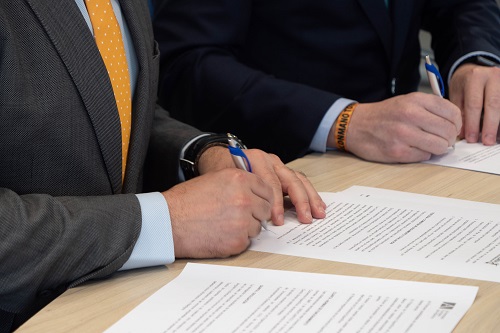 En el acto protocolario de la firma de renovación del convenio, celebrado en el campus, han participado el rector, Rubén Calderón y el presidente del Balonmano Torrelavega, Alejandro Gómez.
