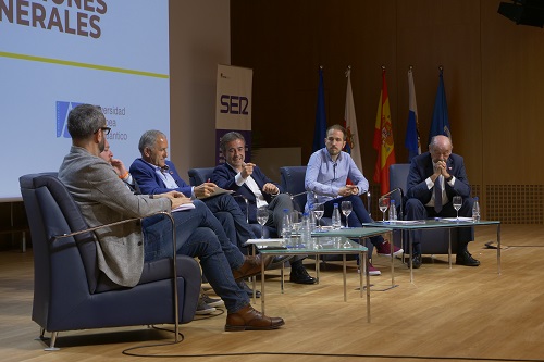 Los cabezas de lista de los cinco principales partidos políticos que se presentan por Cantabria a las elecciones generales del próximo día 28 de abril debatieron en el campus de UNEATLANTICO sobre las posturas que mantienen en cuatro bloques temáticos. Había un sexto partido invitado, Vox, que, sin embargo declinó la participación. De izquierda a derecha, ocuparon sus lugares en el salón de actos de la universidad Rubén Gómez (Ciudadanos), Luis Santos Clemente (PSOE), Diego Movellán (PP), Luis del Piñal (Podemos) y José María Mazón (PRC).