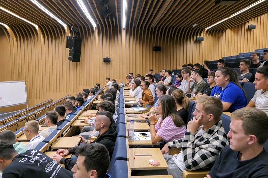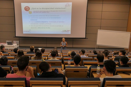 Pernía explicó a los estudiantes en qué consiste la discapacidad intelectual y lo que supone para una persona tener una limitación importante en su funcionamiento, haciendo hincapié en que esta limitación es “consecuencia de la interacción de las capacidades limitadas del individuo con el medio en el que vive”. Por ello, habló de la importancia de ser consciente de que “todos tenemos limitaciones y discapacidades”, y lo expuso en una metáfora en la que relata las dificultades que tendría una persona que no entiende el idioma chino, y que se encuentra de viaje en China, con personas que no saben hablar su lengua y en un lugar donde tampoco existen señalizaciones adaptadas que pueda comprender. Con ello, quiso hacer entender que, en situaciones como esa, necesitas “apoyo para tener autonomía”, es decir, “ayuda del entorno”.