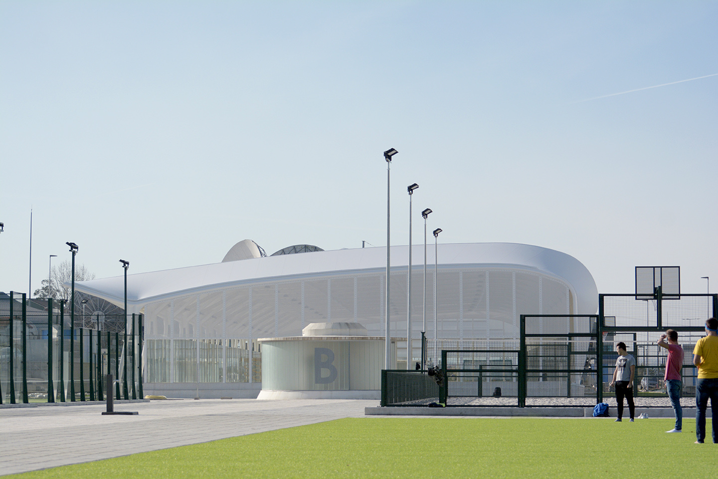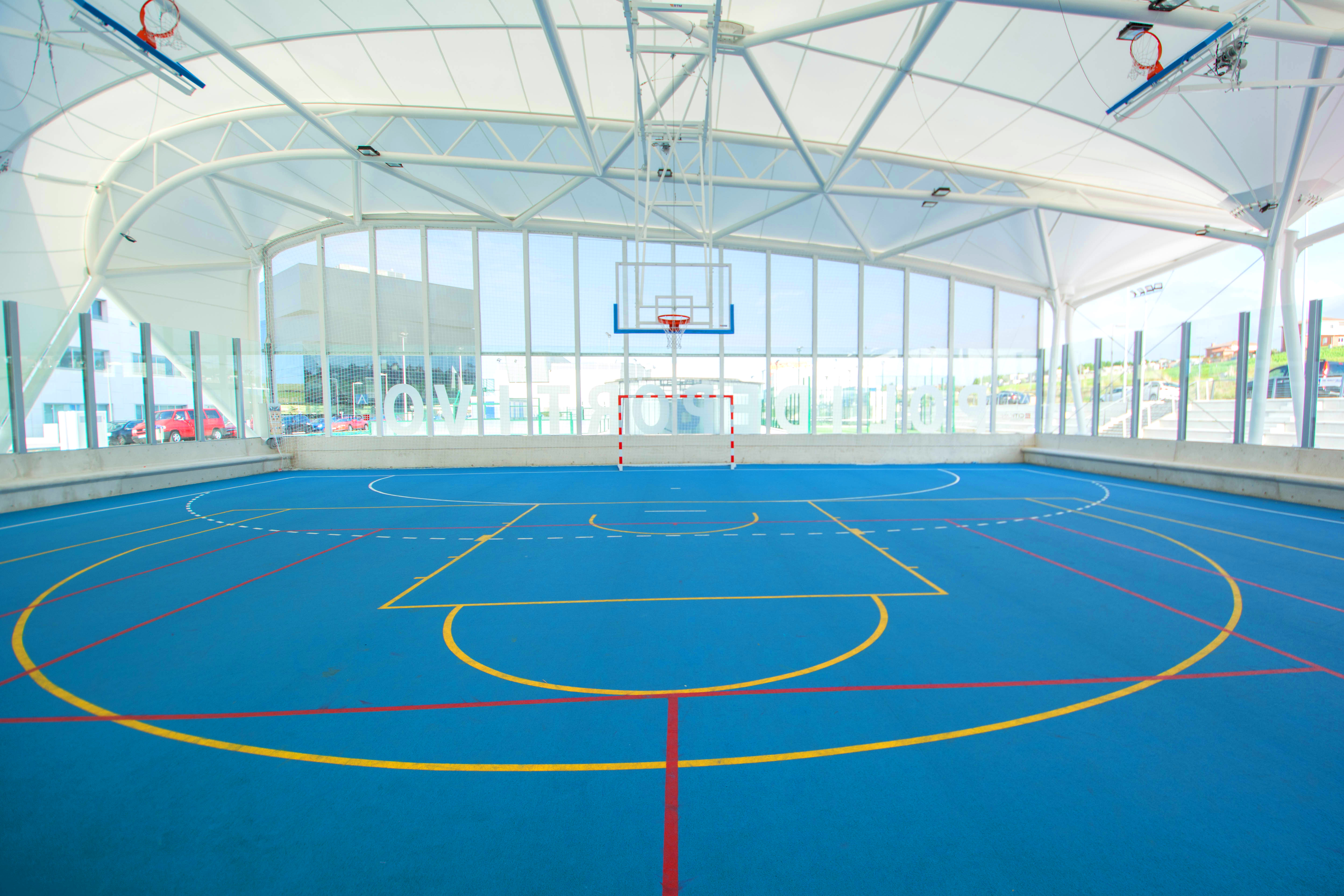 La cubierta textil que envuelve el complejo polideportivo es una estructura metálica de perfilería de aluminio con cableado en acero inoxidable y tejido de poliéster recubierto de PVC por ambas caras que representa un elemento arquitectónico de referencia dentro del Parque Científico y Tecnológico de Cantabria (Pctcan).