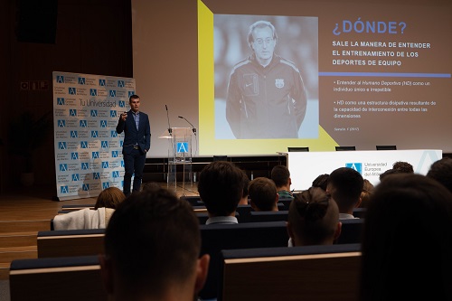 Conde comenzó su intervención animando a los estudiantes del grado en Ciencias de la Actividad Física y el Deporte para seguir su vocación. “Yo no procedo de una familia en la que haya deportistas profesionales. Ni siquiera era el fútbol el deporte que más me interesaba. A mi me gustaba ver los partidos de la NBA y viendo los saltos y el prodigio físico de los jugadores, pensé, yo quiero trabajar en esto”.