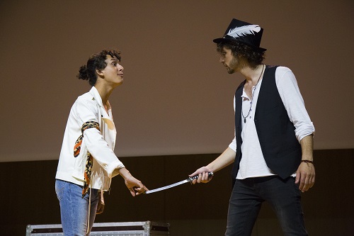 Con Adrián Arrebola en el papel de un sufrido Romeo y Alicia Saiz en una fresca y vivaz Julieta, un total de veintidós actores puso sobre el escenario el texto del autor inglés situando la acción en un imaginario Festival de Música de Verona, que cambió algunos de los escenario del clásico e incluyó algún añadido musical para redondear una obra larga e intensa que fue muy aplaudida por el público.
