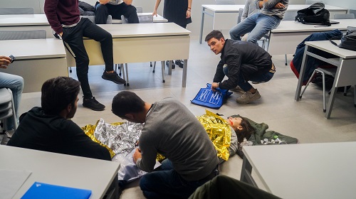 El campus de la Universidad Europea del Atlántico ha sido el escenario de una serie de simulacros de emergencia, que fueron atendidos por equipos formados por estudiantes de cuarto curso del grado en Ciencias de la Actividad Física y el Deporte.