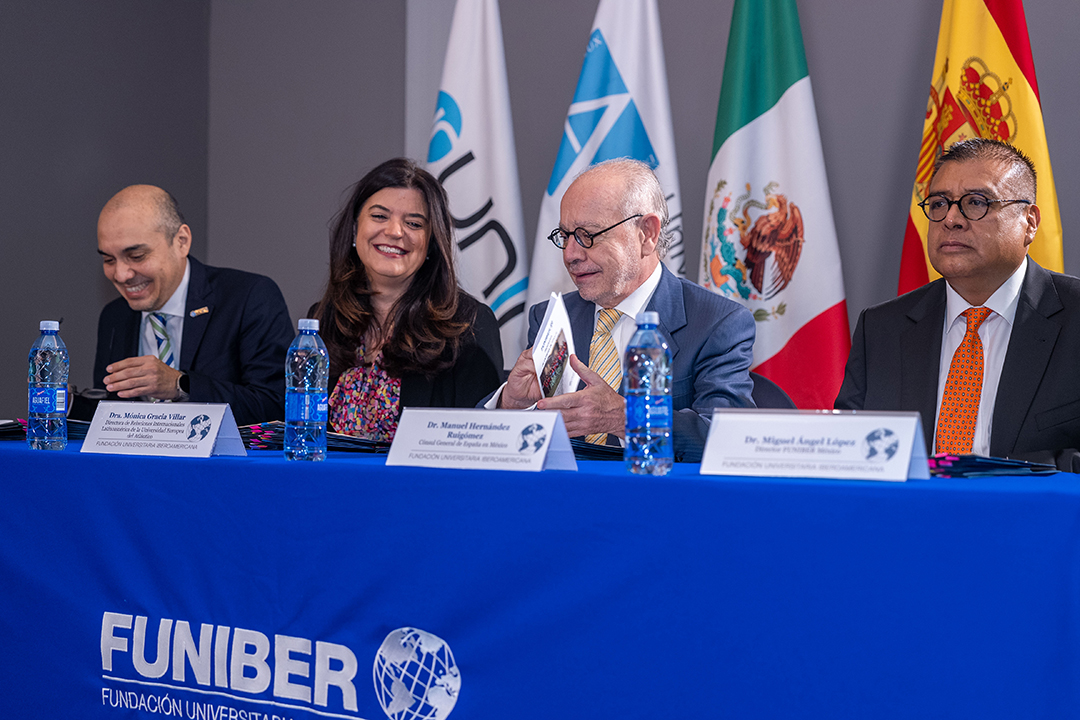 La mesa de honor ha estado compuesta por la directora de Relaciones Internacionales para Latinoamérica de UNEATLANTICO, la Dra. Mónica Gracia; el director de la delegación de FUNIBER en México, el Dr. Miguel Ángel López Flores; el cónsul general de España en México, el Dr. Manuel Hernández Ruigómez; y el rector de UNINI México, el Dr. Luis Dzul.